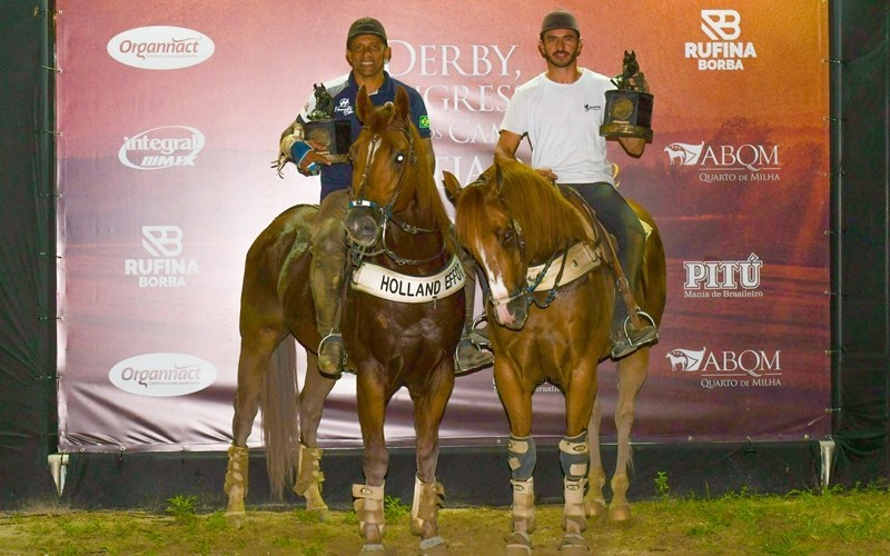 Reinaldo Veloso de Andrade, de São Domingos do Araguaia, no Estado do Pará, levantou o troféu de campeão da categoria Aberta, no 12º Derby ABQM de Vaquejada. O ‘valeu boi’, veio na sela de Holland Effot PDO (Holland Jeck x Eternal Effot), de criação de André Ricardo Santos e de propriedade de Ricardo Sabag Del Castilho. A disputa ocorreu na quinta-feira (17/03).