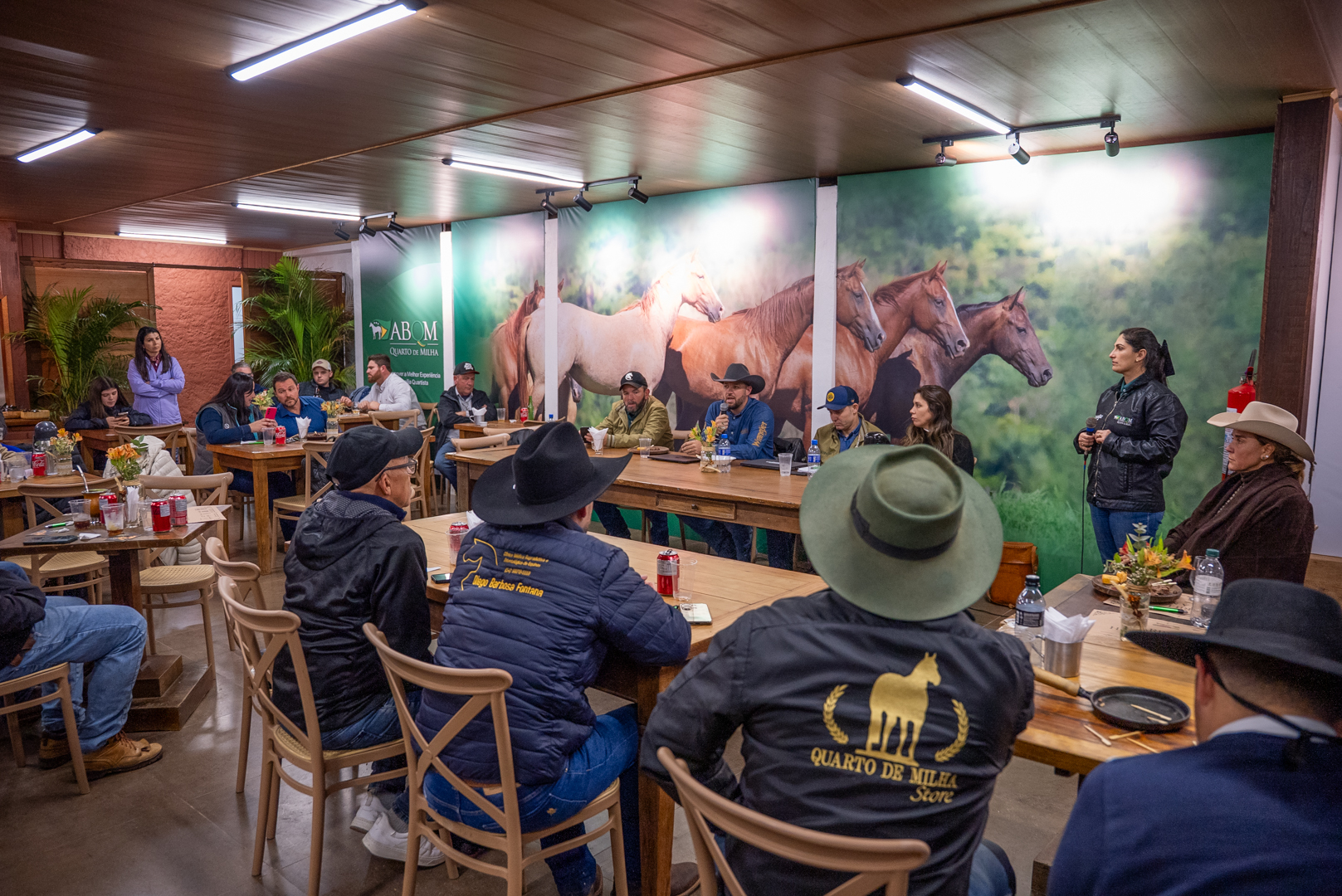 Dando continuidade às atividades da ABQM na 48ª Expointer, em Esteio (RS), a quinta-feira (04) foi marcada pela realização da primeira mesa-redonda da Associação dentro do evento. A iniciativa aproximou criadores e competidores do Quarto de Milha da diretoria da entidade, que apresentou as principais áreas de atuação da ABQM. O encontro contou com intensa participação de quartistas do Rio Grande do Sul e de Santa Catarina, que aproveitaram a oportunidade para esclarecer dúvidas e apresentar sugestões. A diretoria avalia a ação como um passo importante na estratégia de diálogo com associados de diferentes regiões do Brasil, prática que já foi realizada em estados como Mato Grosso do Sul e São Paulo.