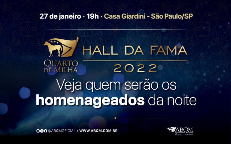 No 12º Hall da Fama serão eternizadas oito personalidades (entre animais e pessoas) que contribuíram e ainda contribuem para o desenvolvimento do Quarto de Milha no Brasil. No evento mais aguardado do ano pela família quartista, serão premiados ainda animais, competidores, proprietários e criadores da raça no 15º ABQM Awards.