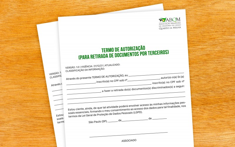Com o objetivo de dar mais segurança aos seus processos e serviços, a Associação do Quarto de Milha (ABQM) passou a exigir um termo assinado, para retirada de documentos por terceiros. O ‘Termo de Autorização’ já está disponível no portal da ABQM, no link ‘Impressos’.