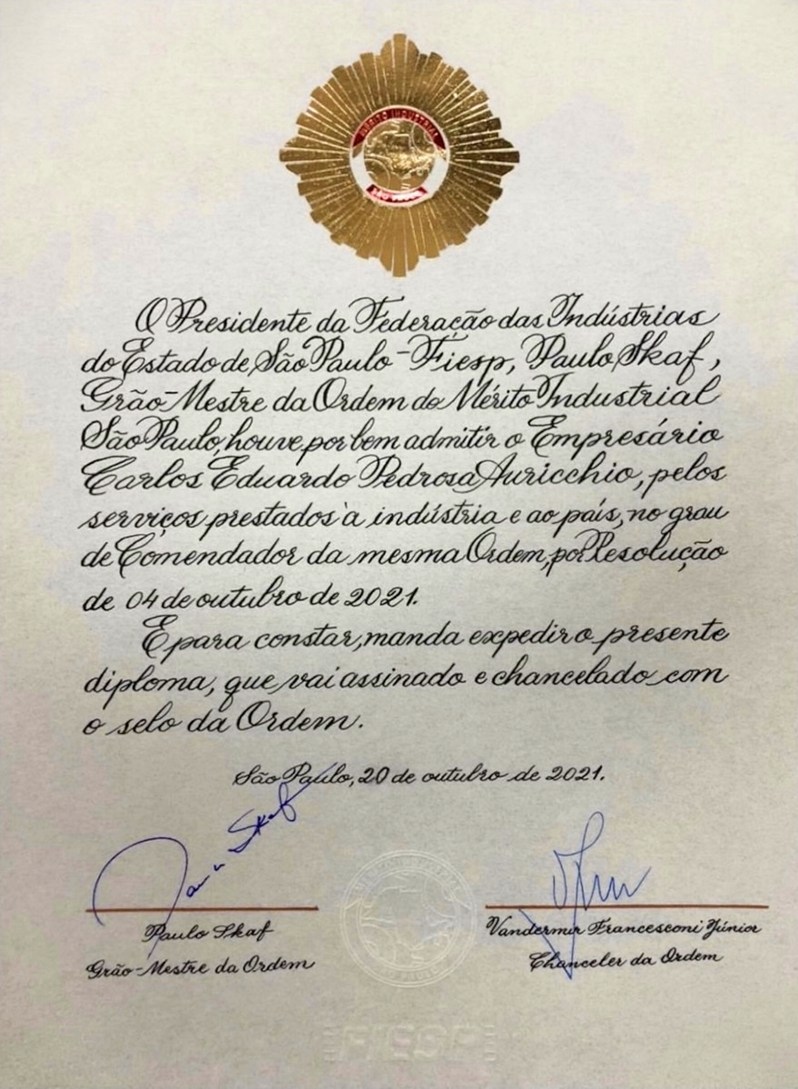 “O Presidente da Federação das Indústrias do Estado de São Paulo – Fiesp, Paulo Skaf, Grão Mestre da Ordem do Mérito Industrial São Paulo, houve por bem admitir o Empresário Carlos Eduardo Pedrosa Auricchio, pelos serviços prestados à indústria e ao país, no grau de Comendador da mesma Ordem, por Resolução de 04 de outubro de 2021.