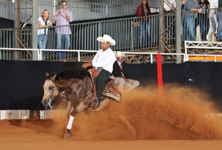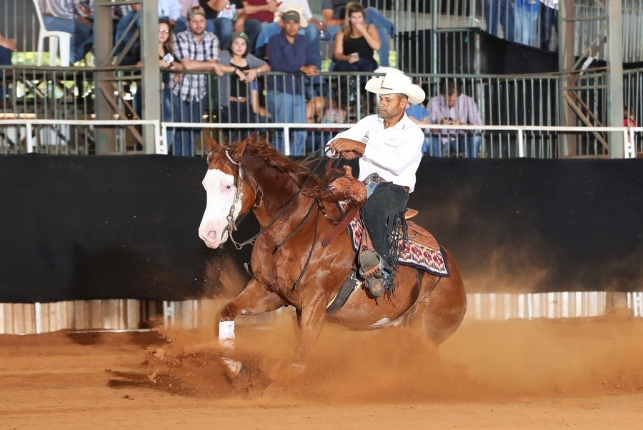 A Arena RAM foi tomada por uma intensa carga de emoção e adrenalina nas disputas pelos títulos da modalidade Rédeas. E quem se destacou mais uma vez foi o campeoníssimo Marcelo Almeida da Silva, o Marcelinho, como é conhecido, levando para Ibiúna (SP), quatro títulos de campeão, trabalhando com três animais castrados. Na Aberta Junior, categoria com 18 conjuntos, e na Junior Castrado, ele deu o galope da vitória com Dun It Lena, filho de Country Dun It e Andylena, tirando a nota 216, cujo proprietário é Thomaz Luiz Cabral Menezes, também da mesma cidade.
