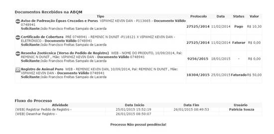 No caso acima, o criador enviou o pedido de registro via web no dia 25/01/2015 às 15:52 e, às 08:49 do dia seguinte, o animal encontrava-se registrado sob o número P198541. Ou seja, em menos de 20 horas a ABQM validou todas as regras do registro e emitiu o número. Um exemplo de eficiência e agilidade.