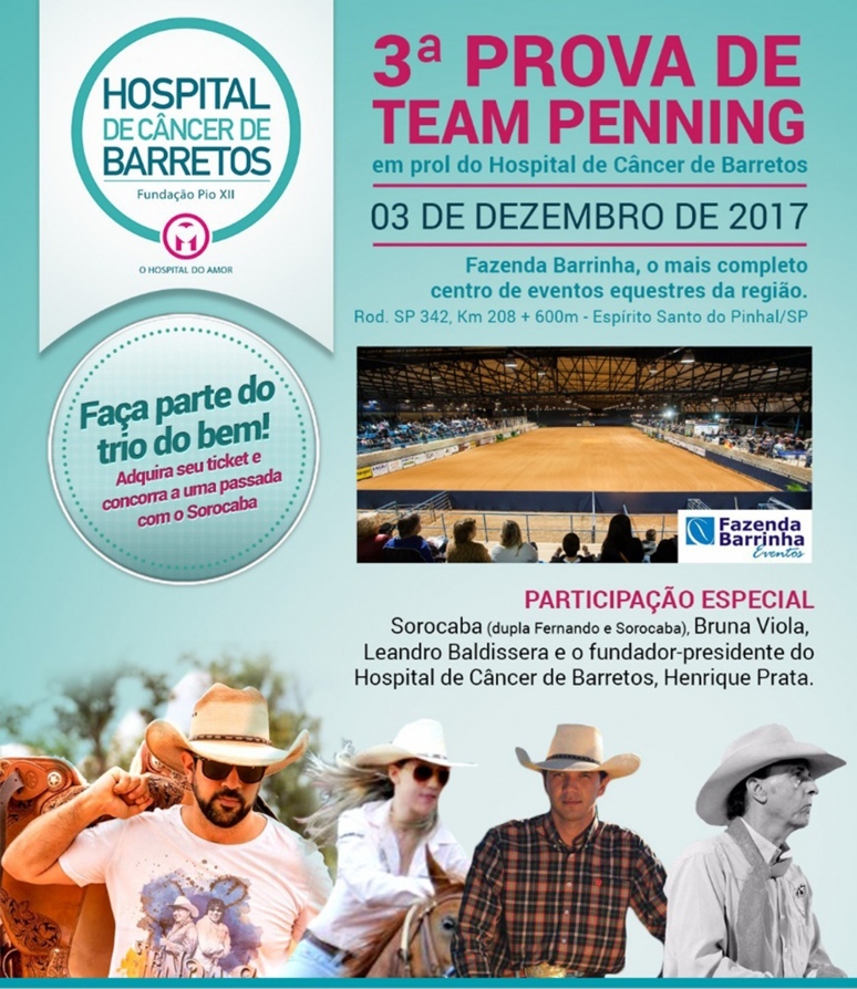 O evento será na Fazenda Barrinha, em Espírito Santo do Pinhal (SP), no dia 3 de dezembro, e contará com a presença de celebridades como o cantor Sorocaba (dupla Fernando & Sorocaba), Bruna Viola, Leandro Baldissera e o fundador-presidente do Hospital de Câncer de Barretos, Henrique Prata. “Para essa terceira prova, já ganhamos várias coberturas de expressivos garanhões e estamos fazendo um leilão em grupos no WhatsApp e, com isso, estamos arrecadando dinheiro para fazer as premiações para cada categoria. Serão dois handicaps (somatórias 6 e 10) e, com as inscrições, queremos ajudar o hospital integralmente”, informou Pedro Cossulin.