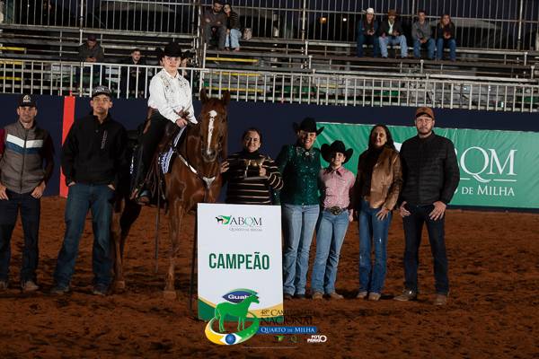 Luiza de Souza Camargo, montando Tagstar (Whiz N Tag Chex x Miss Steppin Star), conquistou o título na categoria Jovem Principiante – 14 a 18 anos. O alazão é de propriedade de Luiz de Souza Camargo e criação de Eduardo Christians.